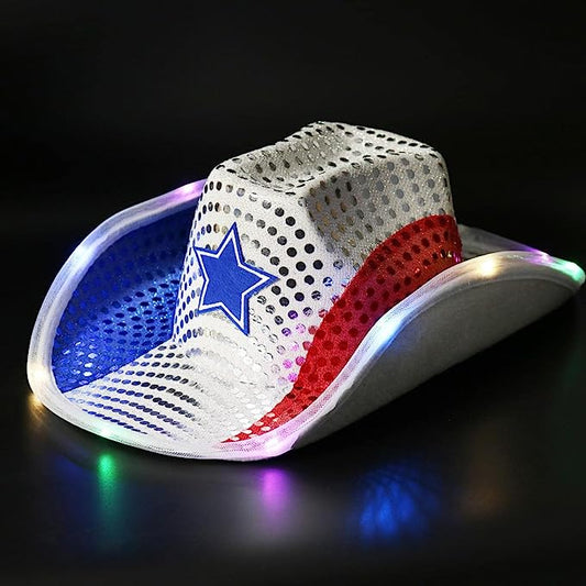 GIFTEXPRESS 4pcs Patriotic Red White Blue Sequin Blue Star Light Up Cowboy Hat